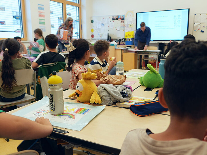 Ehrenamtliche unterstützt Schulkinder beim gemeinsamen Lernen im Klassenraum