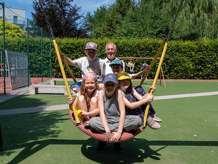 Ehrenamtliche unterstützt Schulkinder beim gemeinsamen Lernen im Klassenraum