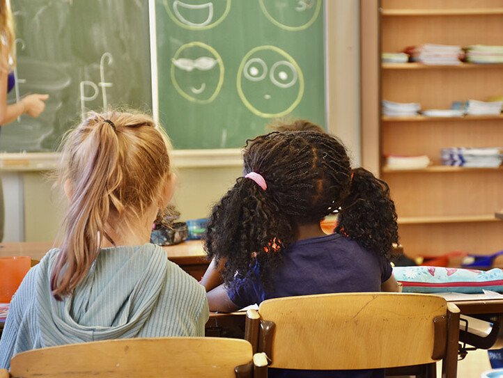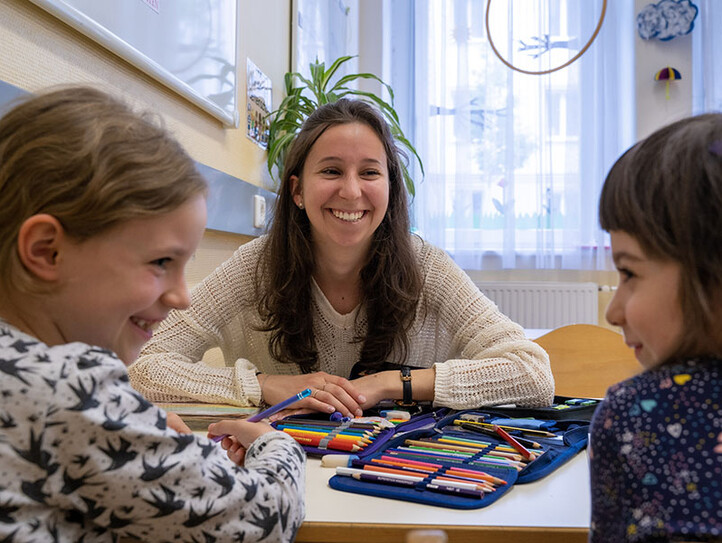 Ehrenamtliche unterstützt Schulkinder beim gemeinsamen Lernen im Klassenraum